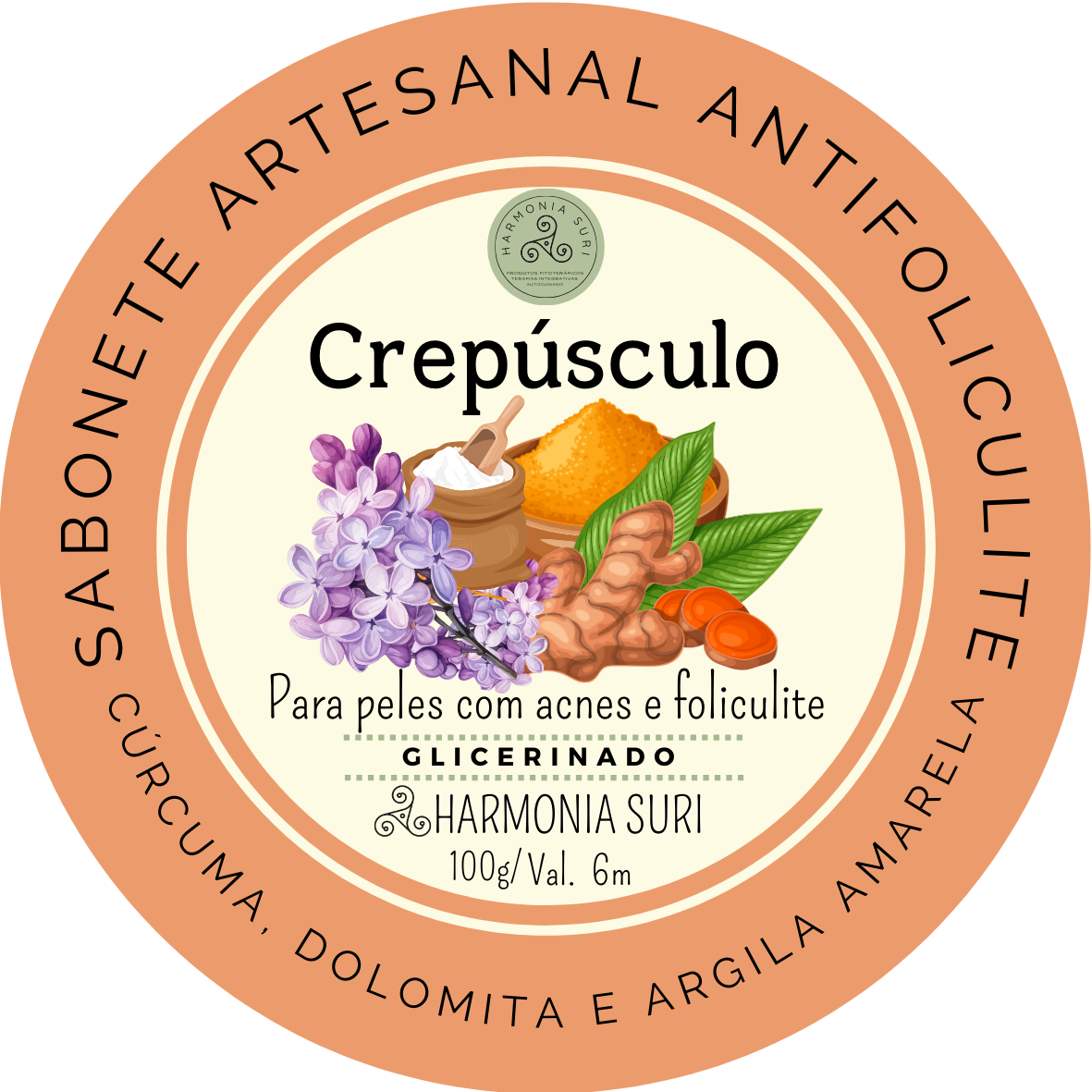Base vegetal glicerinada, Óleos Vegetais, Manteigas Vegetais, Dolomita, Cúrcuma, Argila Amarela, Essenciais de Capim Limão e Bergamota e Óleos Essenciais de Lavanda, de Copaíba e Gerânio.