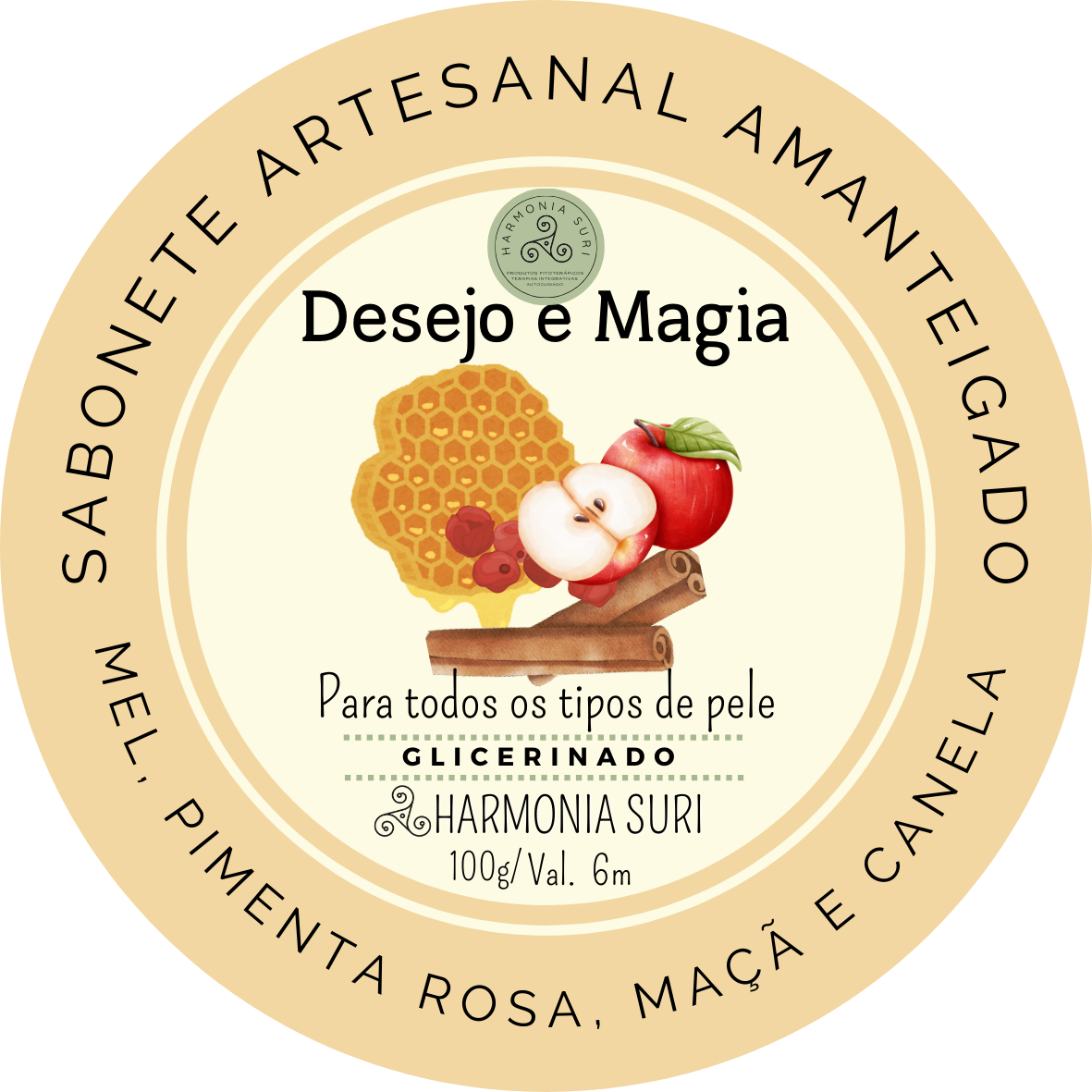 Base Vegetal Glicerinada, Lauril, Óleo Vegetal, Manteiga Vegetal, Vitamina E, Bepantol, Óleo Essencial de Canela e Essência de Maçã, Canela, Mel e Pimenta Rosa.