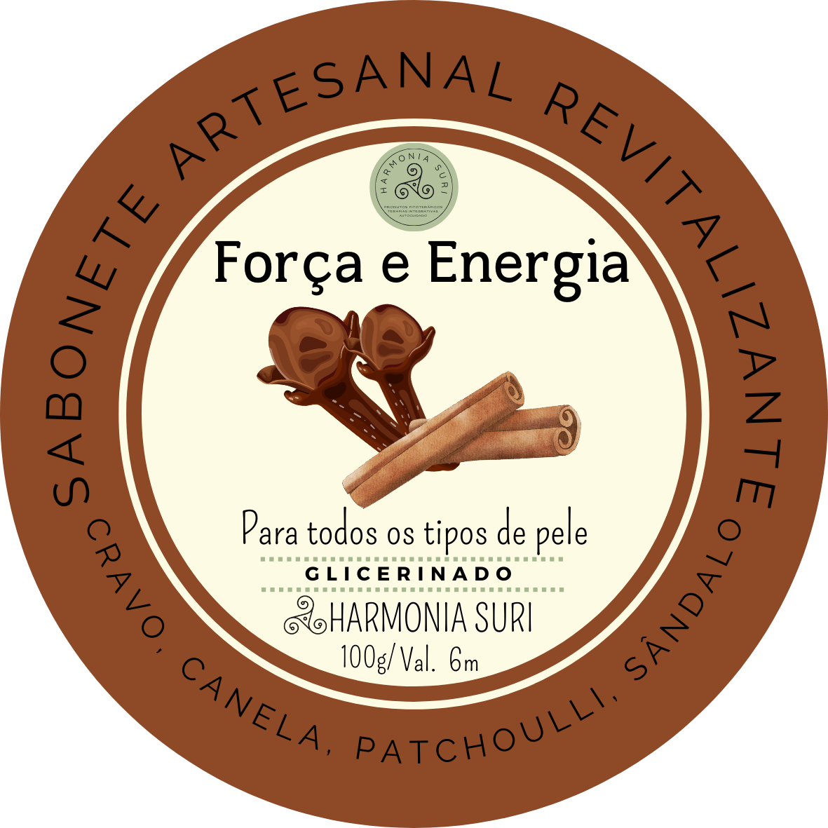 Base Vegetal Glicerinada, Lauril, Óleo Vegetal, Manteiga Vegetal, Vitamina E, Bepantol, Canela, Pimenta Rosa, Cravo da Índia e Óleo Essencial e Essência de Canela, Cravo, Patchoulli, Sândalo.