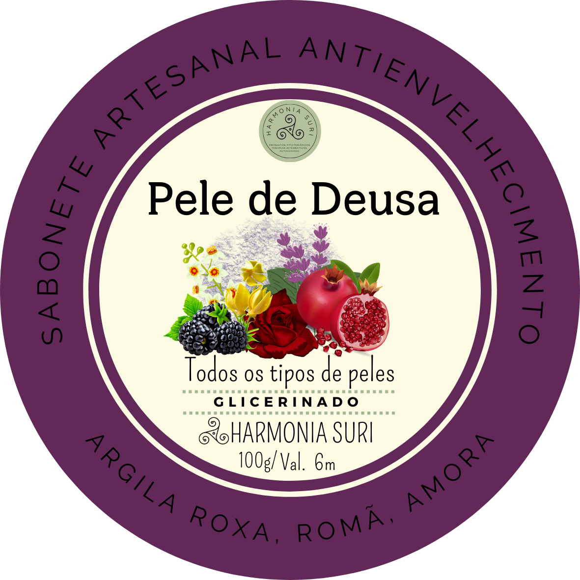 Base Vegetal Glicerinada, Óleos Vegetais, Argila Roxa, Extratos Glicólico de Romã e Amora, Manteigas Vegetais, Essência de Romã, Óleos Essenciais de Ylang Ylang, Patchoulli, Olíbano e Rosas.